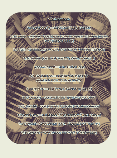 At any NA meeting, you will have the opportunity to hear addicts share their experience, strength, and hope.