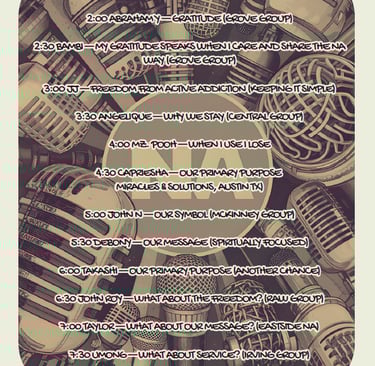 At any NA meeting, you will have the opportunity to hear addicts share their experience, strength, and hope.